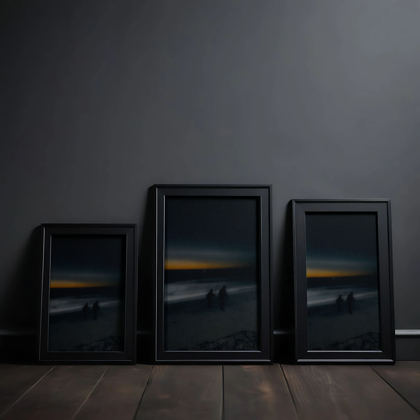 Esta composición minimalista captura la belleza inquietante de lo desconocido: siluetas que emergen de la bruma, un paisaje que invita a la reflexión, y la sensación de estar suspendido entre dos mundos.